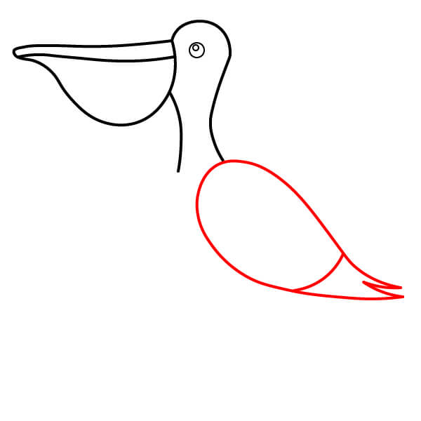 Desde la parte inferior del cuello (donde se une a la bolsa gular), dibuja una línea larga y curva que va hacia abajo y luego hacia atrás, formando el cuerpo principal redondeado del pelícano. Añade una pequeña punta plumosa al final de la cola.