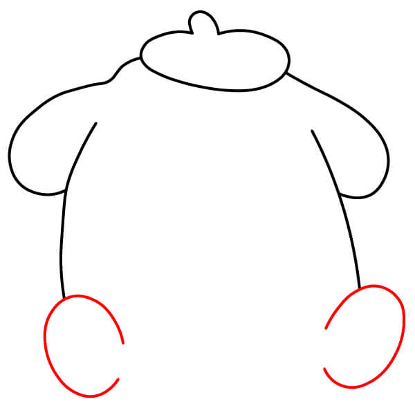 En la parte inferior de las líneas del cuerpo, dibuja dos formas redondeadas, casi ovaladas, para los pies de Pompompurin sentado.