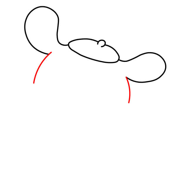 Dibuja una oreja redondeada en el lado izquierdo y una oreja muy grande y caída en el lado derecho de la cabeza, curvándose hacia arriba.