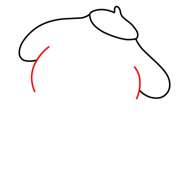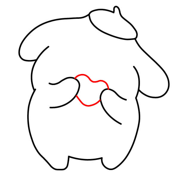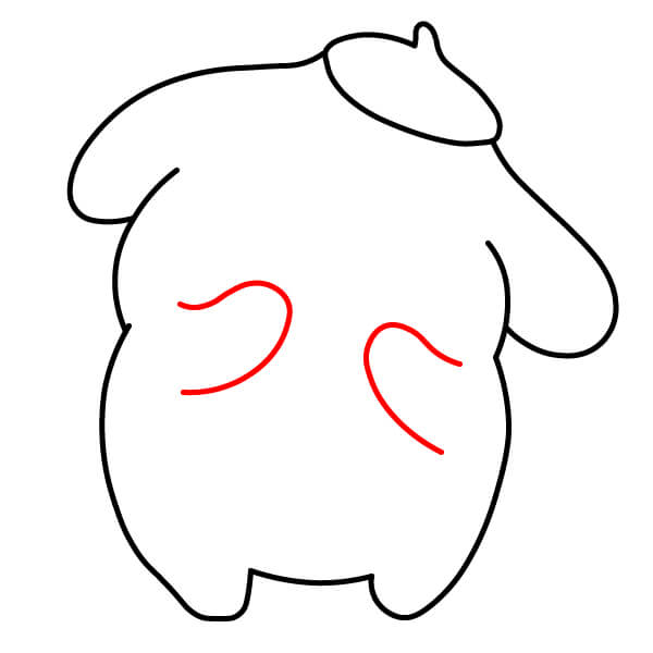 Dibuja dos líneas curvas en la parte frontal inferior del cuerpo para indicar las patas delanteras de Pompompurin descansando sobre su barriga.