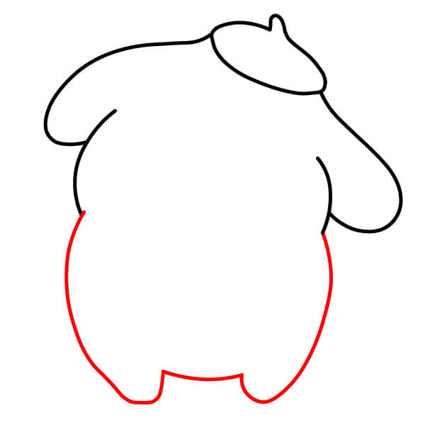 Dibuja una forma grande y redondeada para el cuerpo de Pompompurin, conectando las líneas de los brazos y añadiendo dos pequeños pies redondeados en la parte inferior.