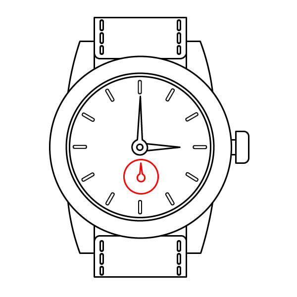 Dibuja un pequeño círculo en la parte inferior de la esfera (alrededor de las 6 en punto). Esta es una subesfera, que suele encontrarse en un cronógrafo, y agrega una pequeña manecilla en su interior.