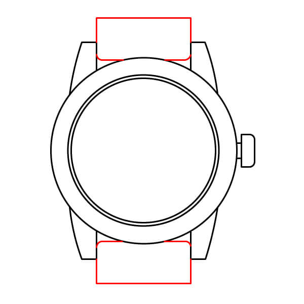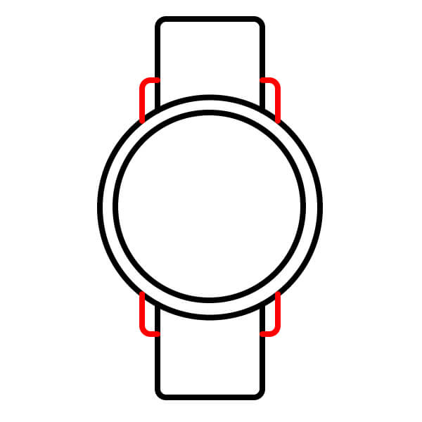Dibuja cuatro rectángulos pequeños y cónicos (dos arriba y dos abajo) que se unen a la caja principal del reloj. Estas son las asas que conectan la caja con la correa.
