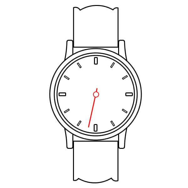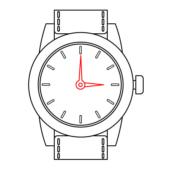 Termina el dibujo coloreándolo. El bisel puede ser amarillo brillante. La correa puede ser verde lima. Las asas y la corona son rojas. La esfera es azul claro. Los marcadores de hora y las manecillas son negros.
