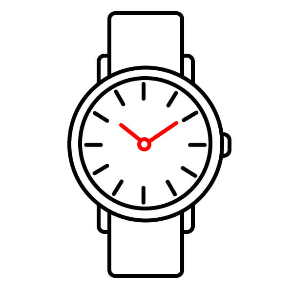 Completa el dibujo coloreando. Colorea la caja y las asas de rojo. Colorea la correa de marrón y la esfera interior de azul claro o verde menta. Colorea los marcadores de hora de negro. Las manecillas de la hora y los minutos se pueden colorear en colores contrastantes, como gris, y el segundero puede ser de negro o de un color intenso para resaltarlo.