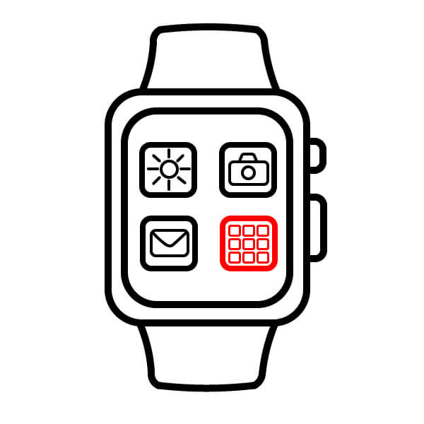 Finalmente, colorea la imagen. La caja y los botones del reloj pueden ser de color verde, la correa puede ser marrón y el fondo de la pantalla puede ser azul claro/cian. Colorea los iconos de las aplicaciones con diferentes colores brillantes (por ejemplo, amarillo para la cámara, morado para el correo, etc.).