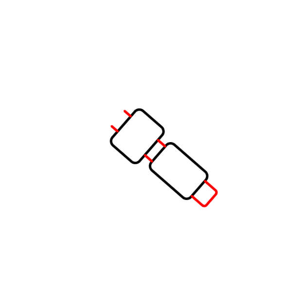 Conecta los dos segmentos del cuerpo con dos líneas horizontales paralelas. Agrega dos pequeñas líneas verticales en la esquina superior izquierda del segmento más cuadrado y una pequeña “U” redondeada en la esquina inferior derecha del segmento rectangular.