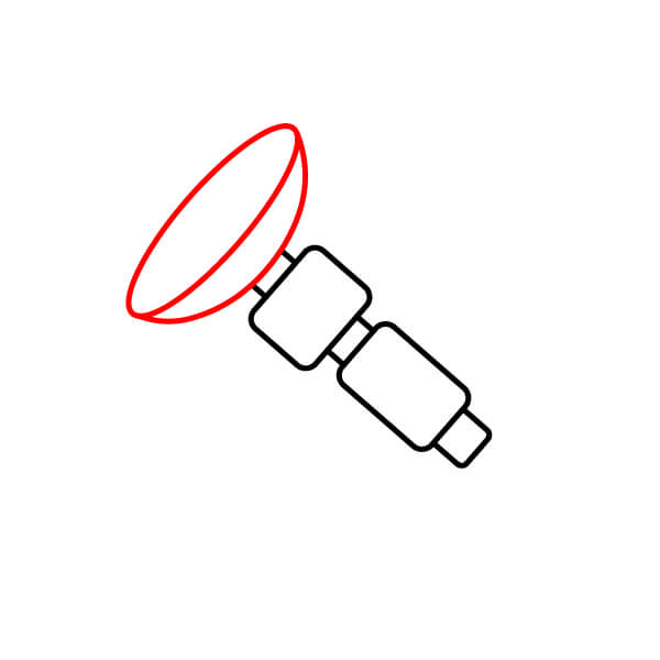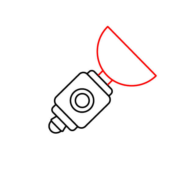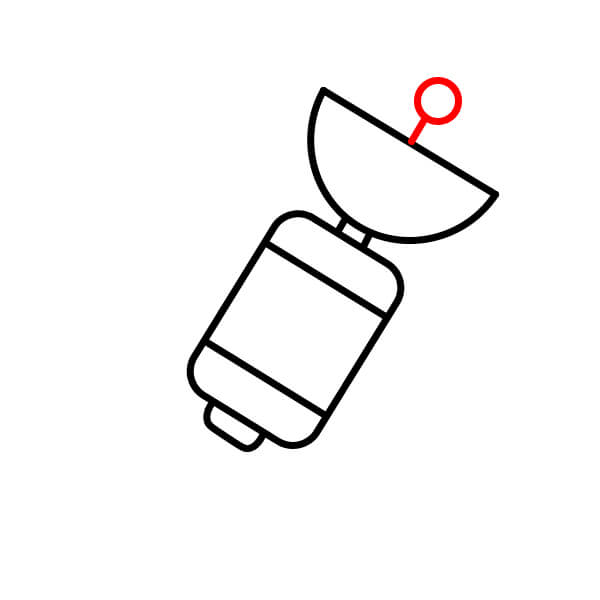 Desde la parte superior del segmento más cuadrado, dibuja una línea corta hacia arriba. Luego, dibuja un óvalo grande en su lateral, similar a una antena parabólica.