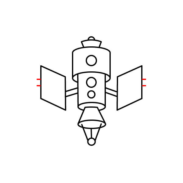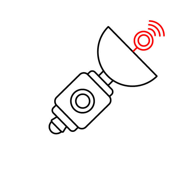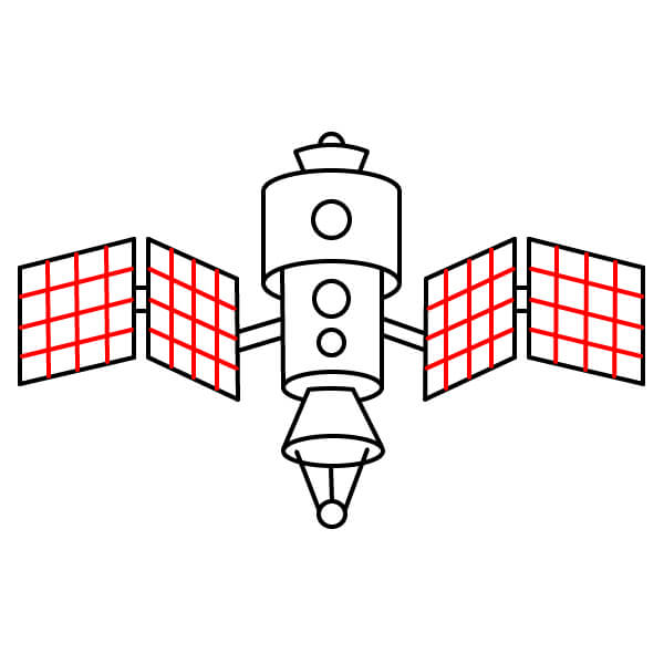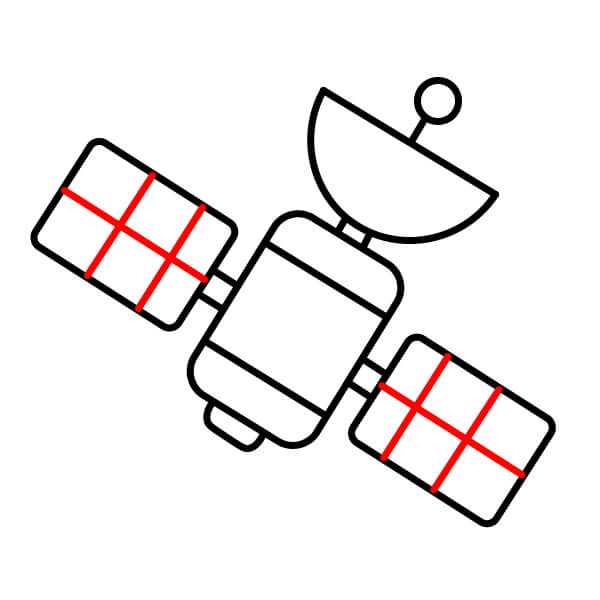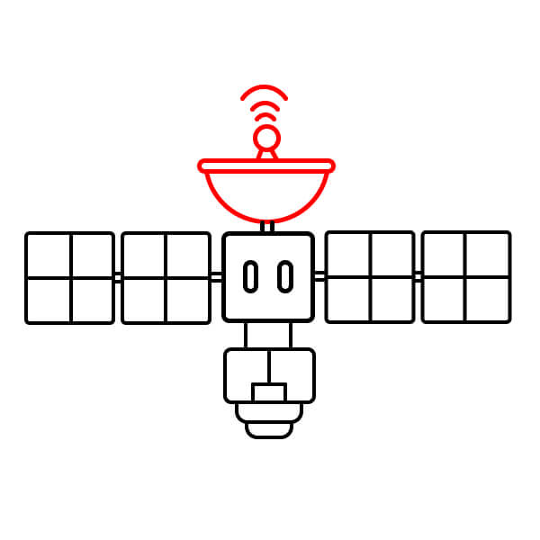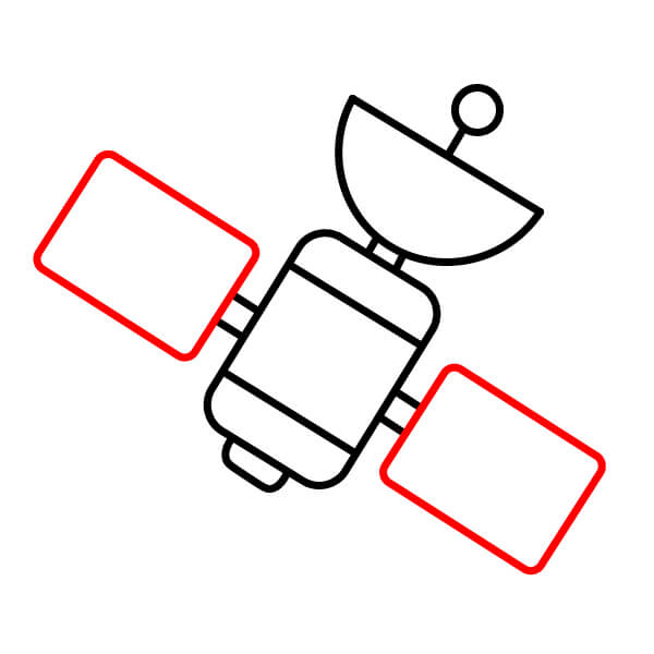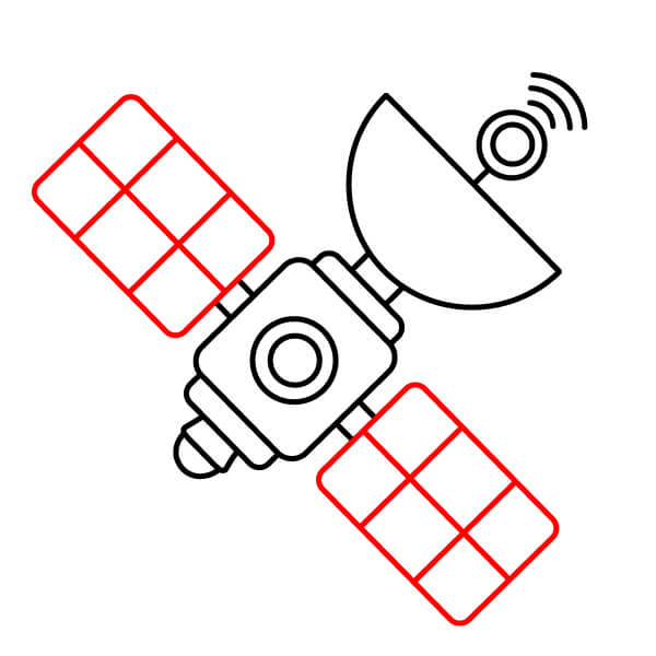 Ahora que has completado el contorno, ¡colorea el satélite! El cuerpo principal es rojo anaranjado con bandas amarillas, la antena parabólica es rojo anaranjado y los paneles solares son azul claro.
