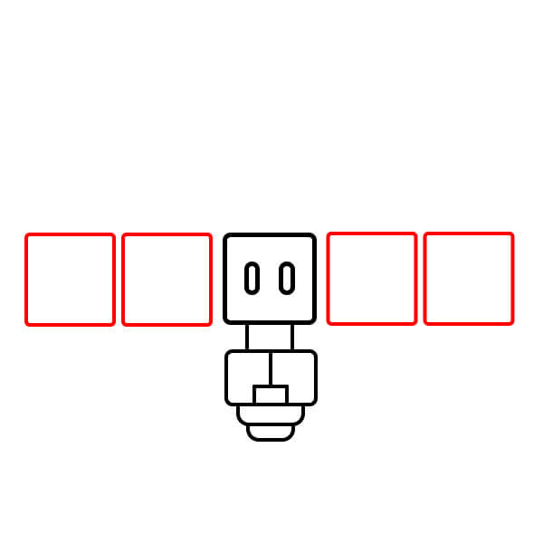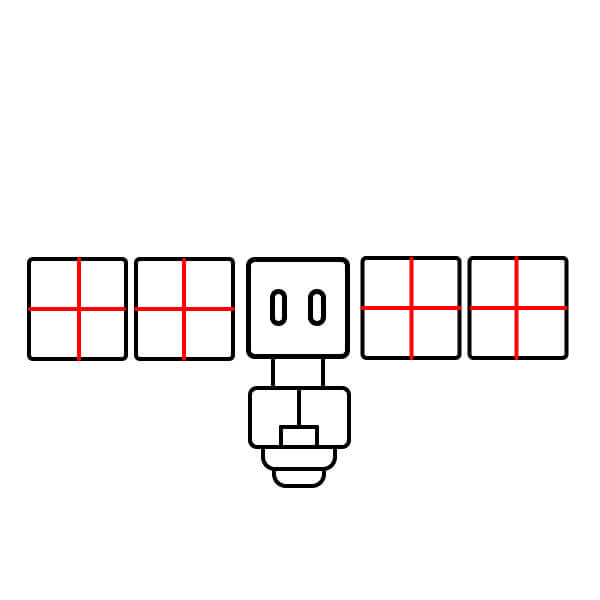Amplía el ancho del satélite dibujando dos marcos cuadrados grandes a la izquierda y dos a la derecha, alineados horizontalmente con el cuerpo principal. Estos representan los paneles solares.