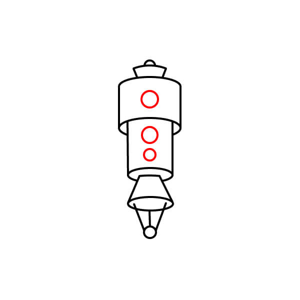 Añade detalles circulares al cuerpo: un círculo centrado en el cilindro superior y dos círculos alineados verticalmente centrados en el cilindro inferior.