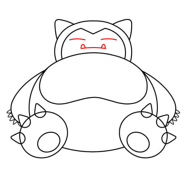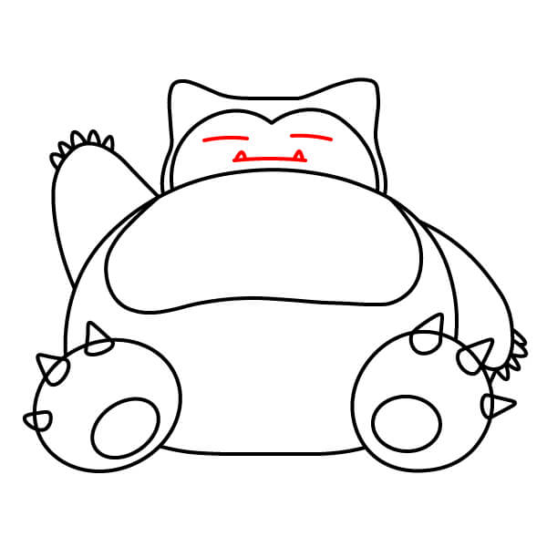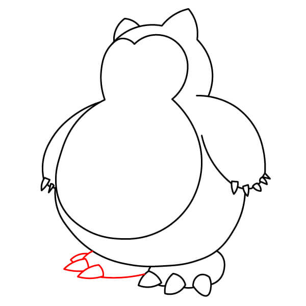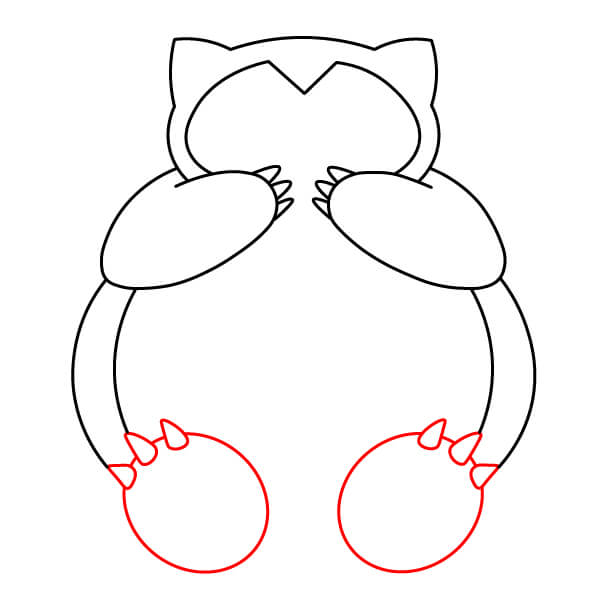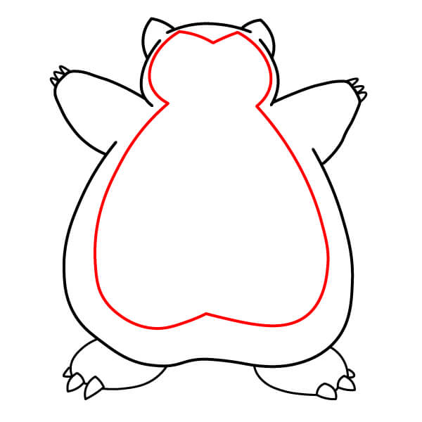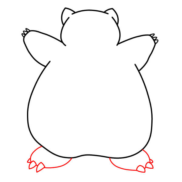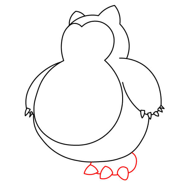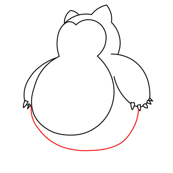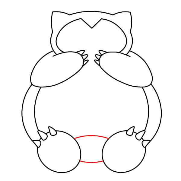 Cierra la parte inferior del cuerpo dibujando dos líneas curvas que conecten la parte interior de los pies. Esto forma el pequeño espacio entre las piernas de Snorlax.