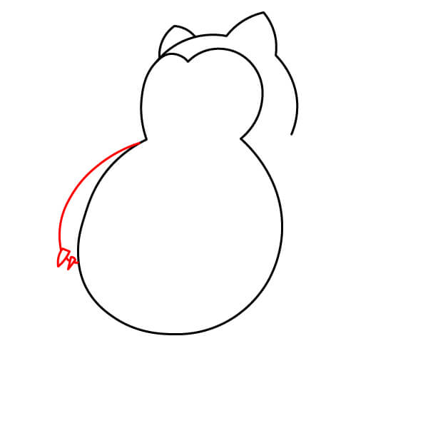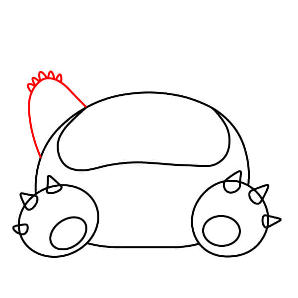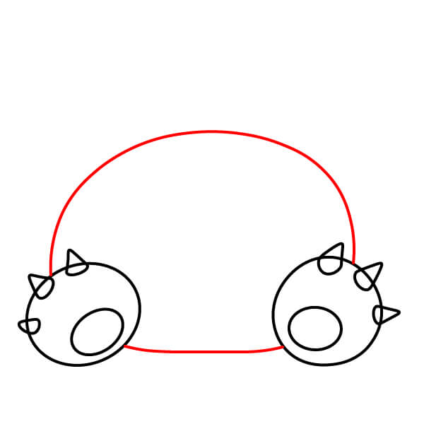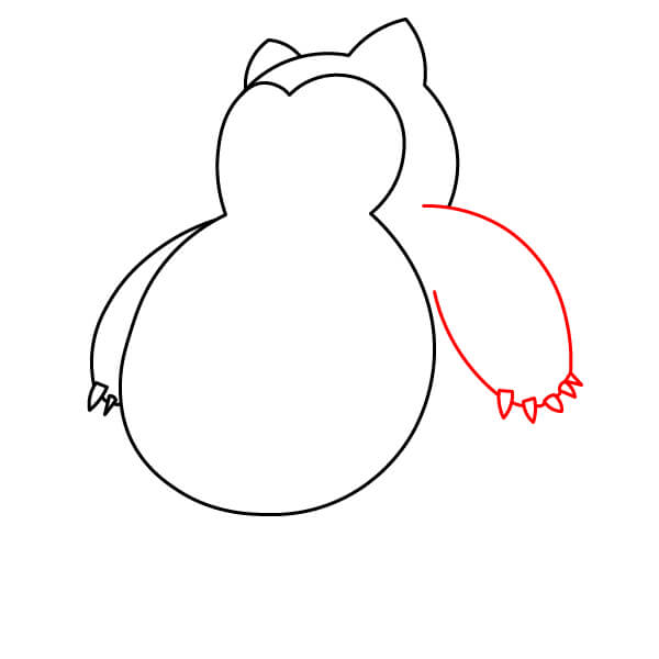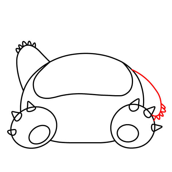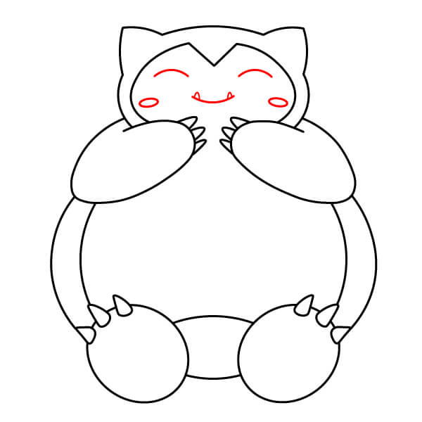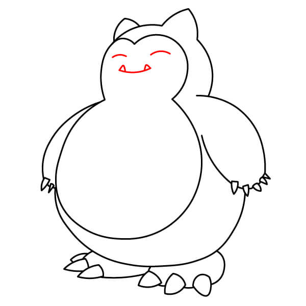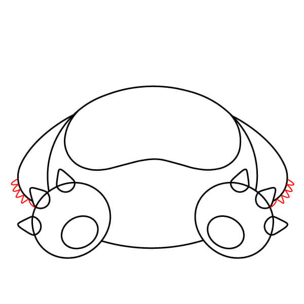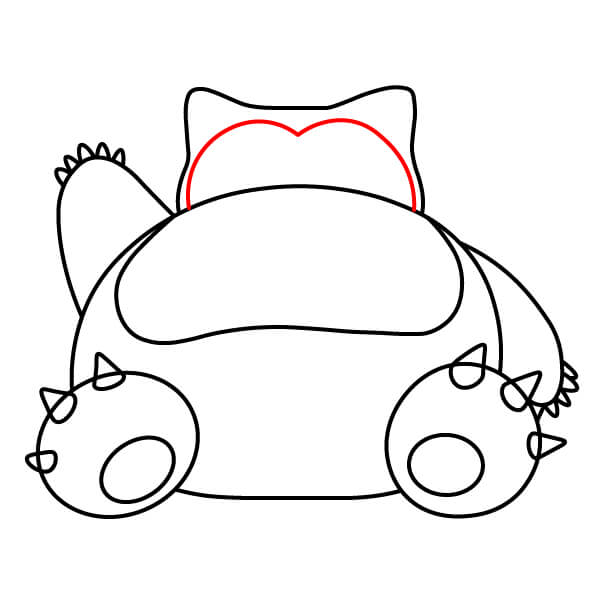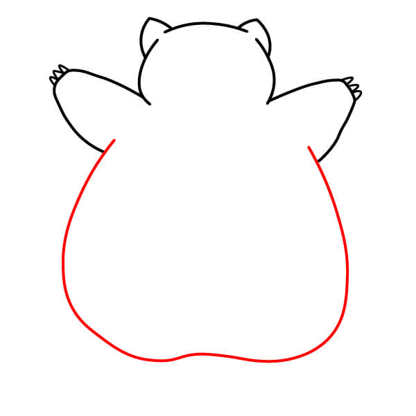 Cierra la parte inferior del cuerpo dibujando dos líneas curvas que conecten la parte interior de los pies. Esto forma el pequeño espacio entre las piernas de Snorlax.