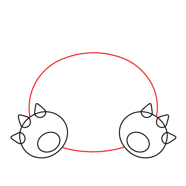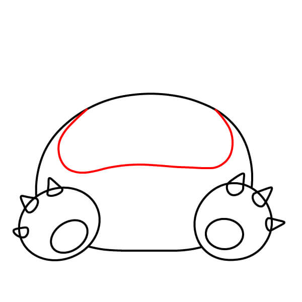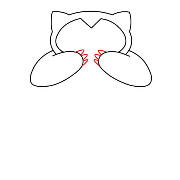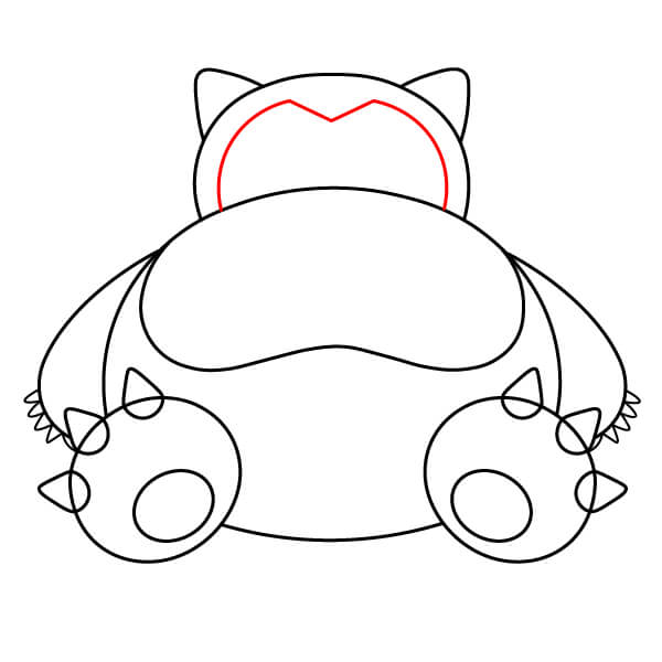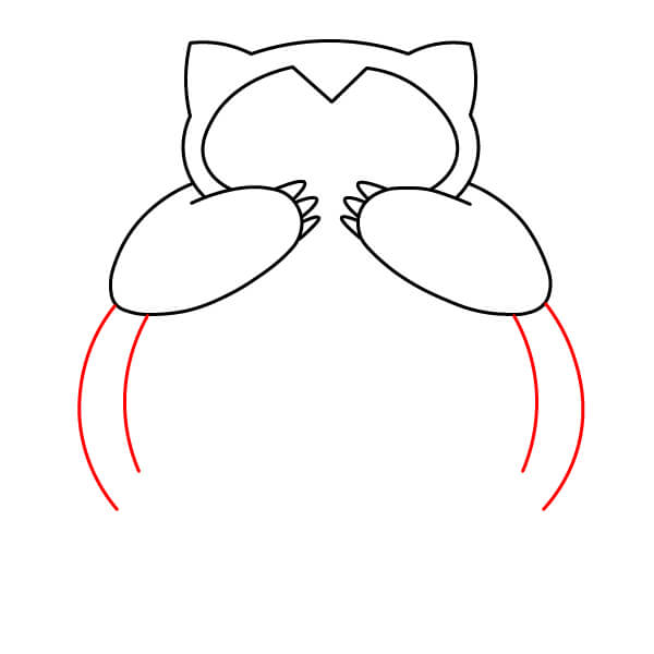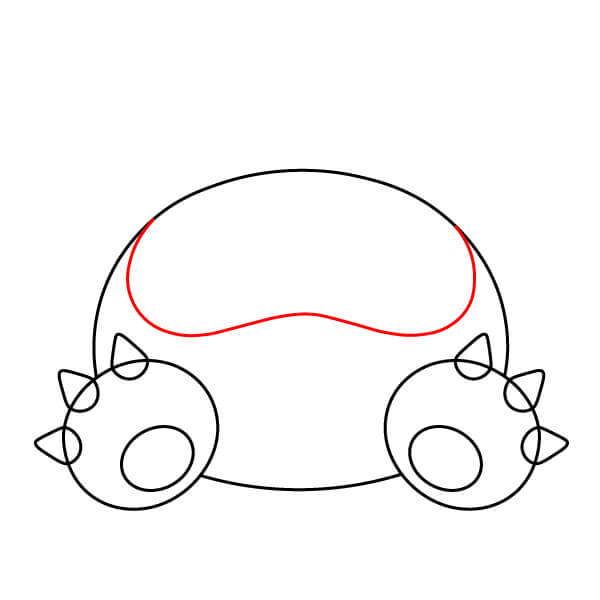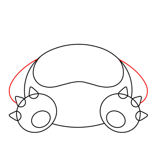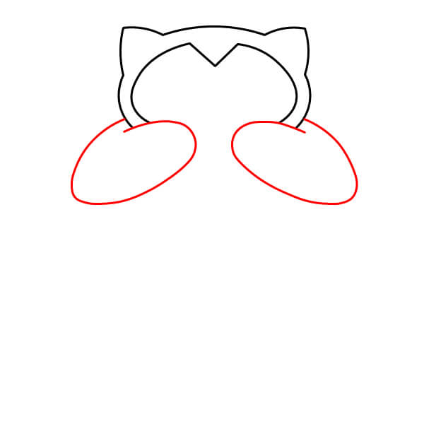 Dibuja dos formas grandes, ovaladas y curvas debajo de la cabeza, ligeramente inclinadas hacia adentro. Estas son las partes superiores de los brazos de Snorlax, que descansarán sobre su pecho.
