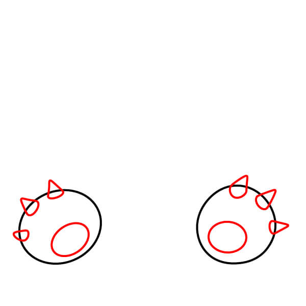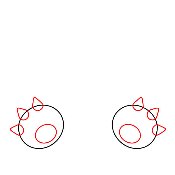 Dentro de cada uno de los dos círculos, dibuja un círculo más pequeño para las almohadillas de las patas. Agrega tres formas triangulares (rojas) al perímetro de cada círculo grande para formar las garras.