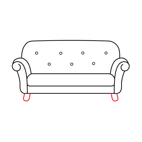 Paso 7: Colorea el dibujo. Usa rojo para todo el cuerpo del sofá, con un rojo más oscuro para los bordes de los reposabrazos y el respaldo. Colorea las patas de un marrón claro.