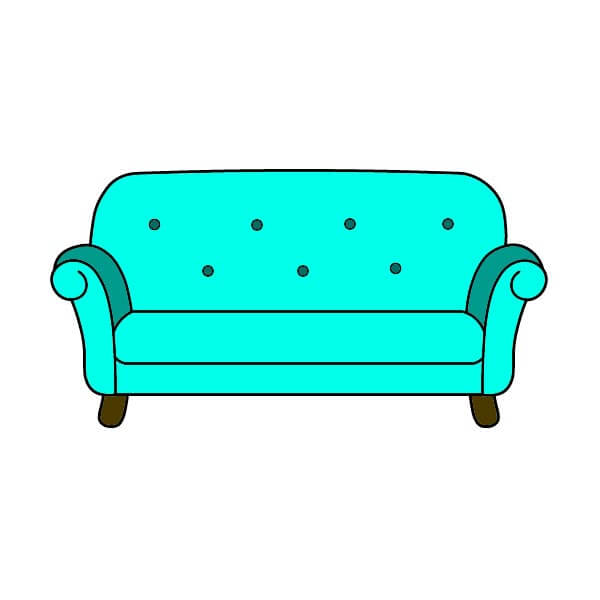 Paso 7: Colorea el dibujo. Usa un azul claro para el cuerpo principal del sofá y un azul más oscuro para los bordes de los reposabrazos y los nudos decorativos. Colorea las patas de un marrón oscuro.