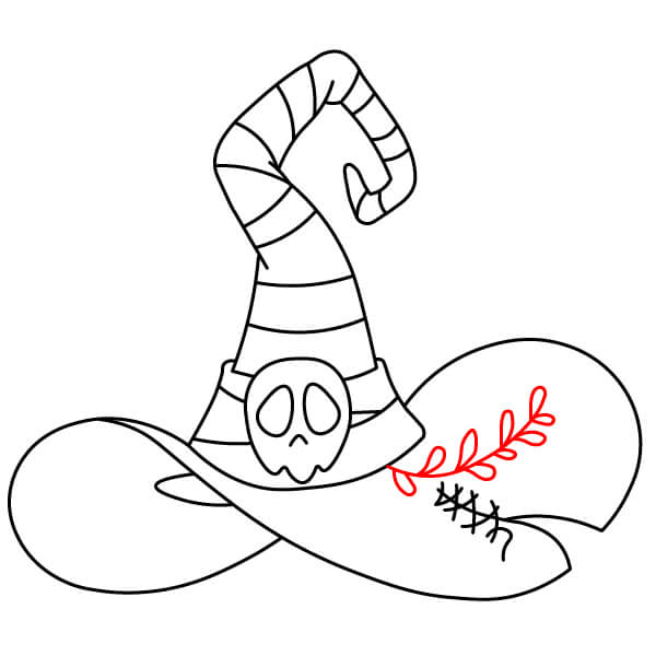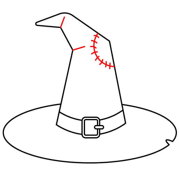 Dibuje algunas líneas rectas cortas cerca de la parte superior del sombrero, luego dibuje una forma curva en el borde del sombrero, rellenándola con pequeñas puntadas para formar un parche.