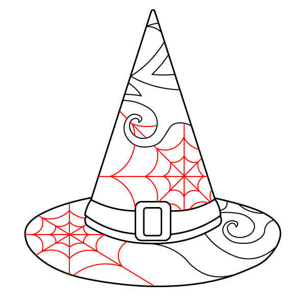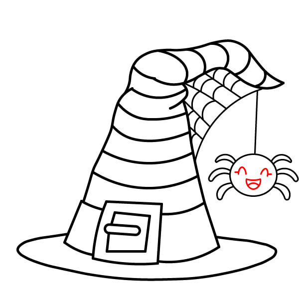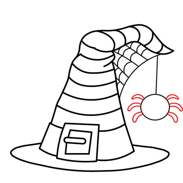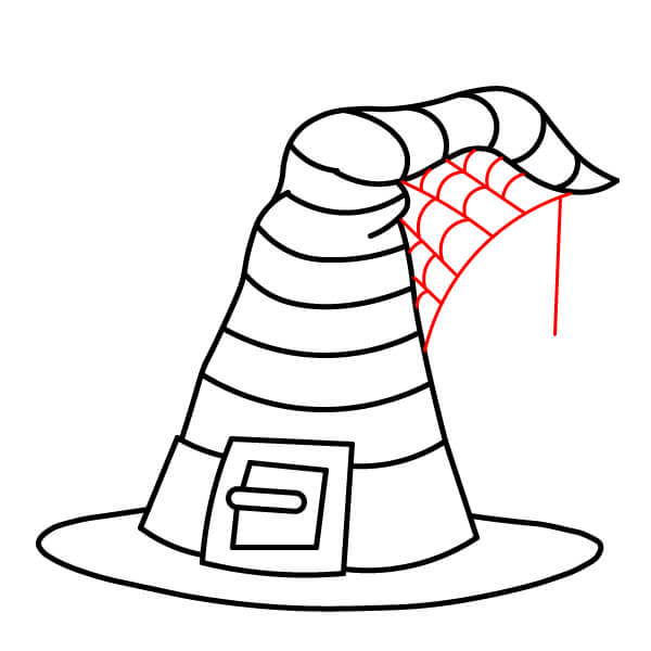 Dibuja unas líneas radiales que se extiendan desde la punta del sombrero, luego líneas curvas cortas que conecten las líneas radiales para formar los hilos pegajosos de la telaraña. Dibuja una línea vertical que cuelgue de la telaraña para formar la telaraña.