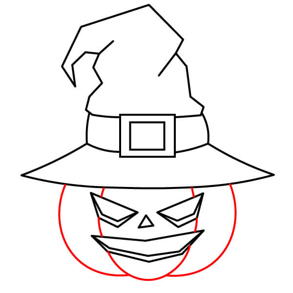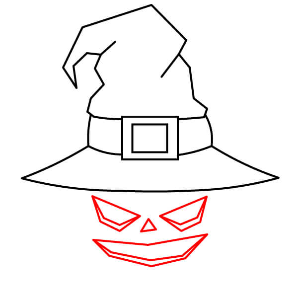 Debajo del ala del sombrero, dibuja una cara de calabaza espeluznante y tallada. Dibuja dos triángulos puntiagudos para los ojos y un triángulo más pequeño para la nariz. Dibuja una boca ancha e irregular con comisuras puntiagudas para crear una sonrisa siniestra.