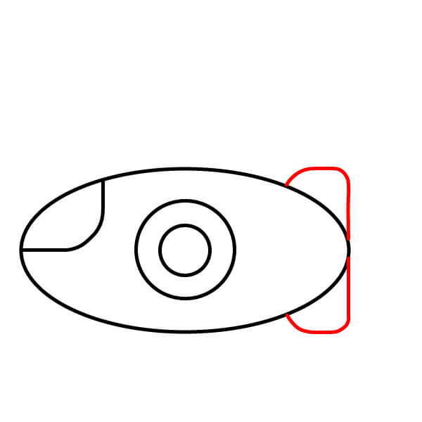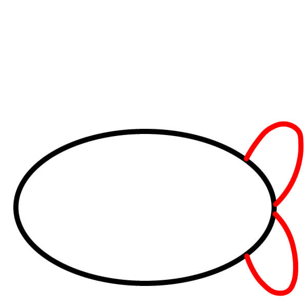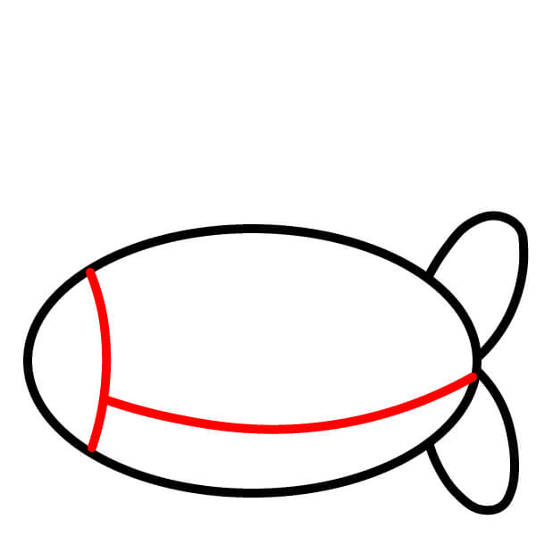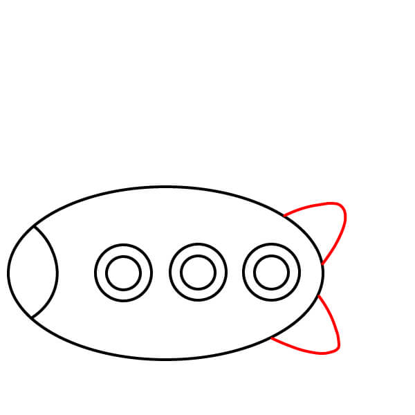 En el lado izquierdo del óvalo, dibuja dos aletas, una encima y otra debajo de la línea central. Además, añade un óvalo pequeño y delgado a la izquierda de las ventanas.