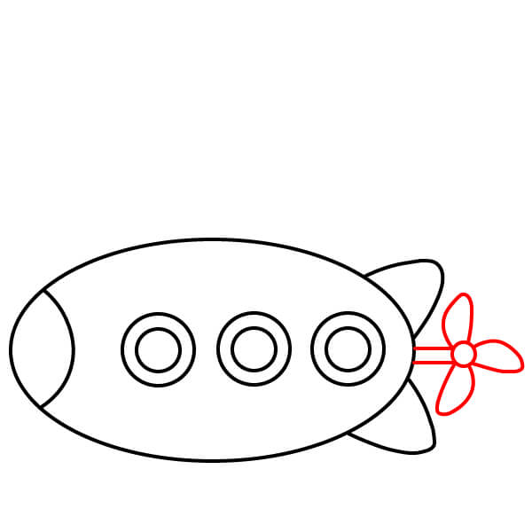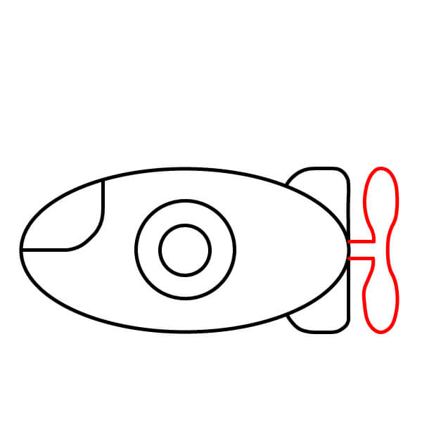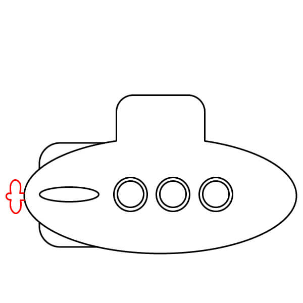 Dibuja una hélice de tres palas en la popa del submarino, conectada por una línea recta en el centro.