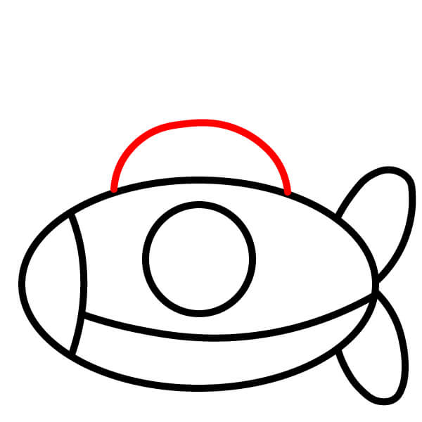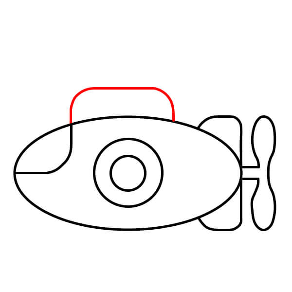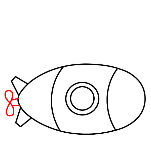 En la popa del submarino (a la derecha del óvalo), dibuja dos curvas para las aletas.
