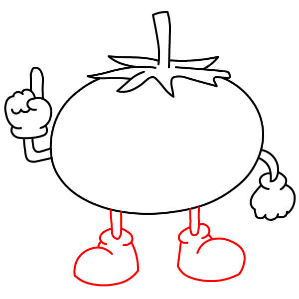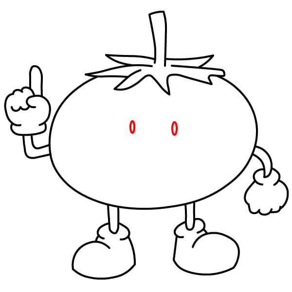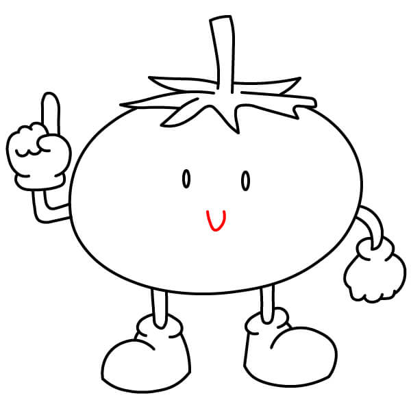 Colorea el tomate de rojo, el tallo y el cáliz de verde, y los brazos, las piernas y los zapatos de amarillo.