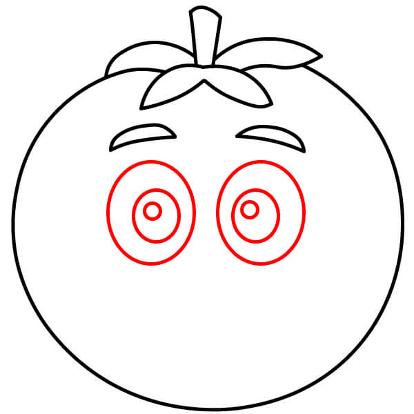 Colorea el tomate de rojo, el tallo y el cáliz de verde, las cejas de negro y el contorno de los ojos de negro con blanco en el interior.