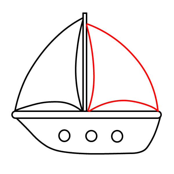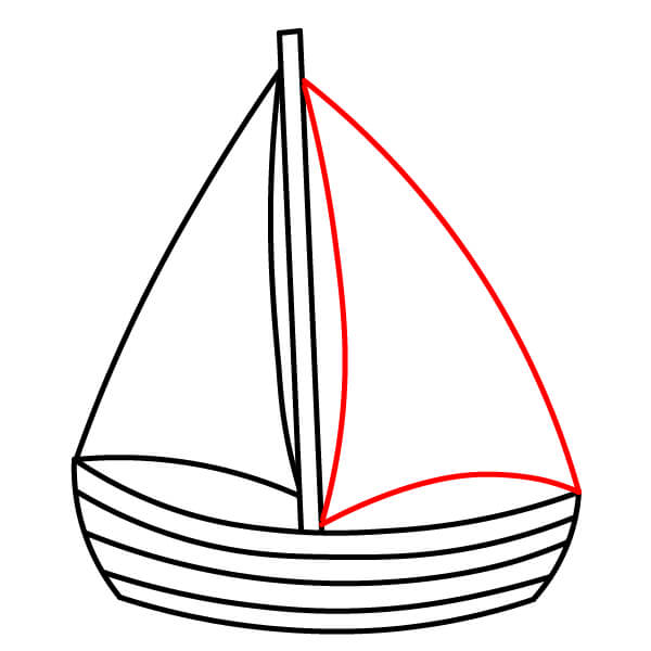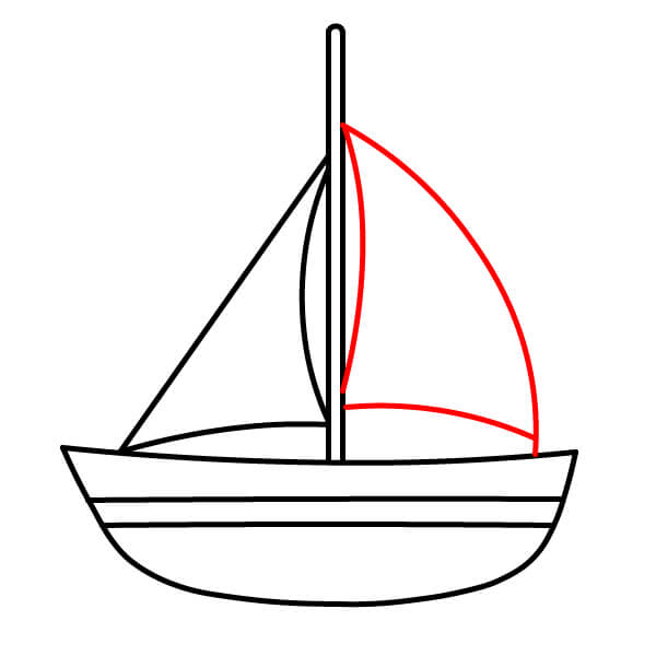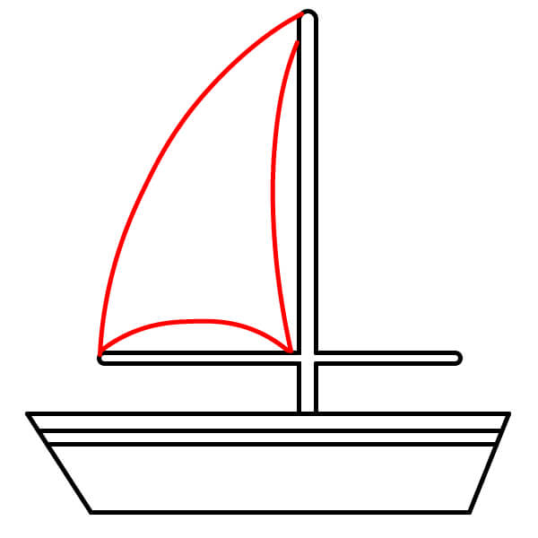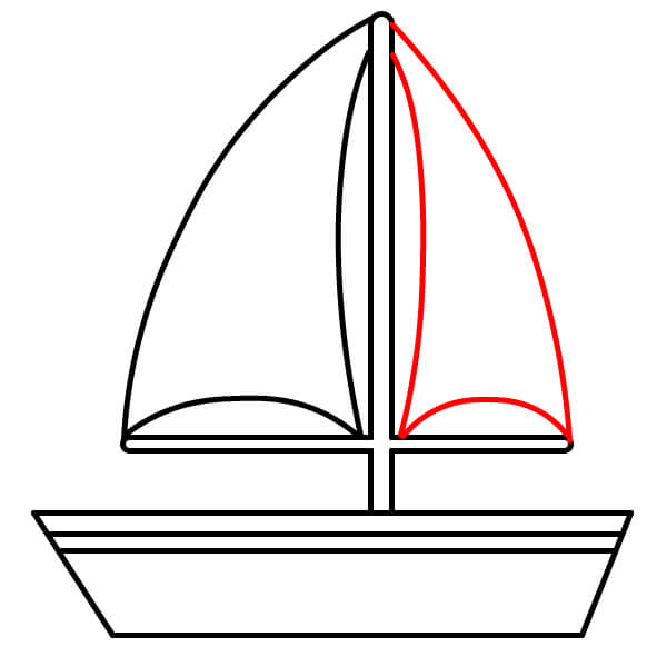 Paso 5: Dibuja otra línea curva desde la parte superior del mástil hasta el borde trasero del barco. Conéctala al mástil con otra línea curva para crear la segunda vela.