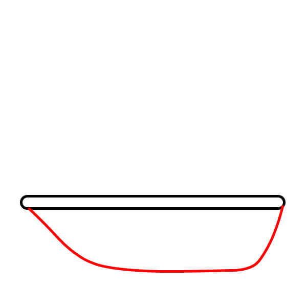 Paso 2: Encima de la base, dibuja otra línea horizontal un poco más larga, también con los extremos redondeados, para formar el borde superior del barco. Conecta los extremos de esta línea con los extremos de la base usando líneas curvas para crear la forma del casco.