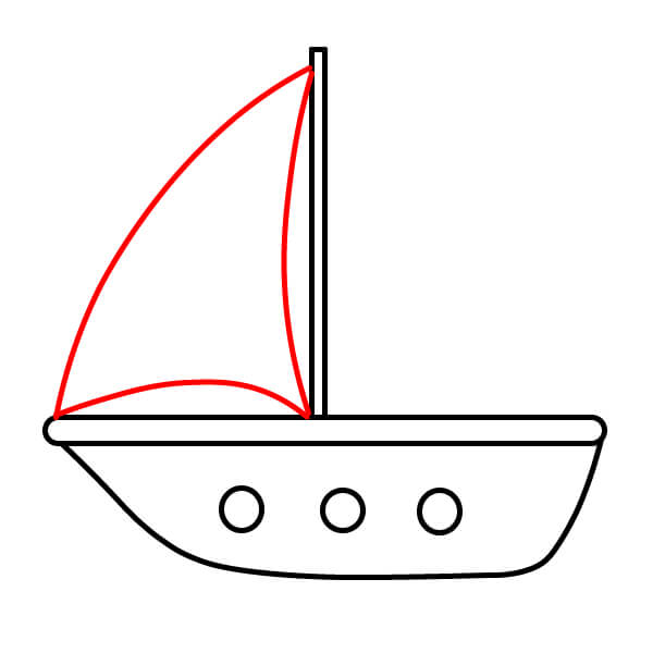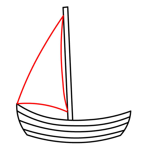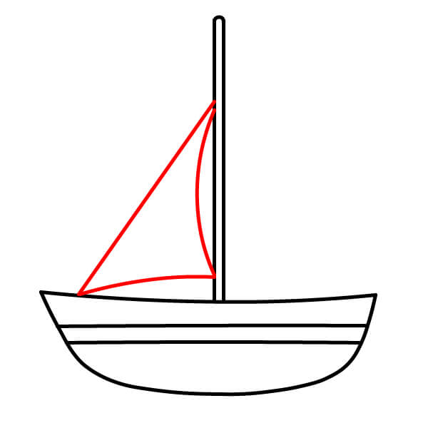 Paso 4: Dibuja una vela triangular grande delante del mástil. La punta superior del triángulo se conecta con la parte superior del mástil y la línea inferior debe ser ligeramente curva, conectándose con la parte delantera del casco del barco.
