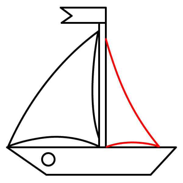 Paso 6: Dibuja una segunda vela más pequeña detrás del mástil. Esta vela también comienza en la parte superior del mástil, se curva hacia abajo hasta el extremo trasero del barco y se conecta nuevamente al mástil con una línea ligeramente curva en la parte inferior.